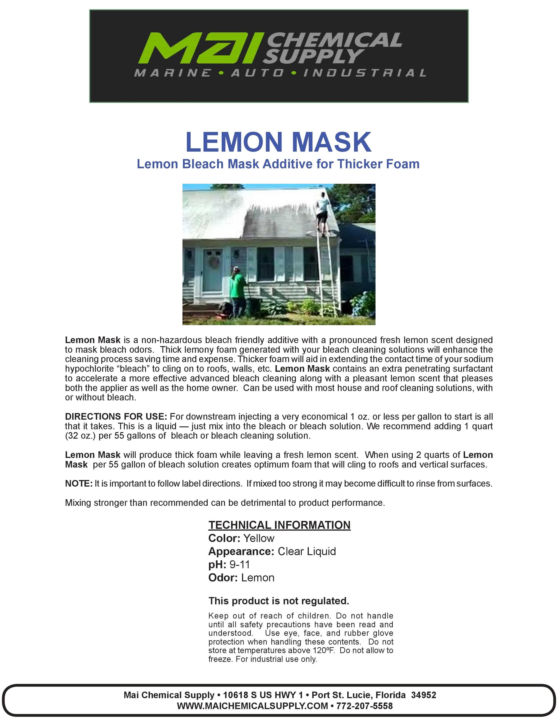DIRECTIONS FOR USE: For downstream injecting a very economical 1 oz. or less per gallon to start is all that it takes. This is a liquid — just mix into the bleach or bleach solution. We recommend adding 1 quart (32 oz.) per 55 gallons of bleach or bleach cleaning solution. Lemon Mask will produce thick foam while leaving a fresh lemon scent. When using 2 quarts of Lemon Mask per 55 gallon of bleach solution creates optimum foam that will cling to roofs and vertical surfaces.